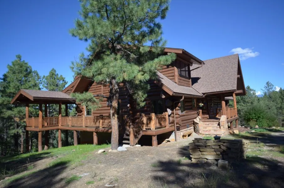 Canadian full round log, masterfully built home on over 35 very private acres just minutes south of downtown Pagosa Springs. Bordered by large tracts of land with no one in sight. Views of Pagosa Peak and the east range of the San Juan Mountains from this ridge top setting. With minimal tree trimming you would have 180 degree views of both ranges. Great room with stunning fireplace and wood floors. Spectacular decks wrap around the entire front of the home from the kitchen to the master bedroom. Huge master bedroom with romantic fireplace, views, soaking Jacuzzi tub, his and hers vanity areas, multi-jet shower and large walk-in closet. Guest bedrooms upstairs perfect for home office/den as well as a large open loft for a reading library, hobby area or play area for kids or grown-ups! Downstairs you will find a Wine cellar, wet bar, theater/game room, and a magnificent steam room for 8+ a...