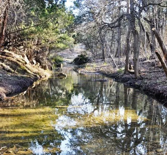 Ranch home on a hill overlooking 35 beautiful acres. Rare rock bottomed creek, hills, trees, and 7 ac livestock pasture. Home is open concept 3 bedroom 2 bath with mesquite counters/vanities, fireplace, oversized living room, large windows, front porch, metal roof, barnwood waynescoat, vaulted tin ceiling, etc.