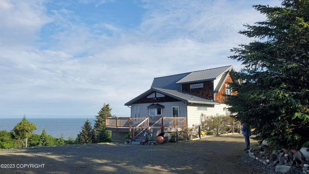 Spectacular 3,812 sq. ft. executive home on 4 acres with unobstructed, gorgeous views of Cook Inlet, mountains, and volcanoes. The main house is meticulously maintained and features a prow front with huge windows, vaulted ceilings with tongue and groove wood, Natural Gas radiant in-floor heat, and lots of custom trim and built-ins throughout. The open, spacious living room has a cozy fireplace, giant windows for soaking in the view, and a convenient balcony work-space. The fantastic gourmet kitchen has beautiful granite countertops, a big breakfast bar, a built in oven and microwave and a special bay window. There are two bedrooms and one full bath, plus two 3/4 baths. The master suite features his and her walk-in closets, and a large jetted tub in the bathroom. Along with the second bedroom suite, downstairs you'll find the family room, home gym, large pantry and craft room. The detache...
