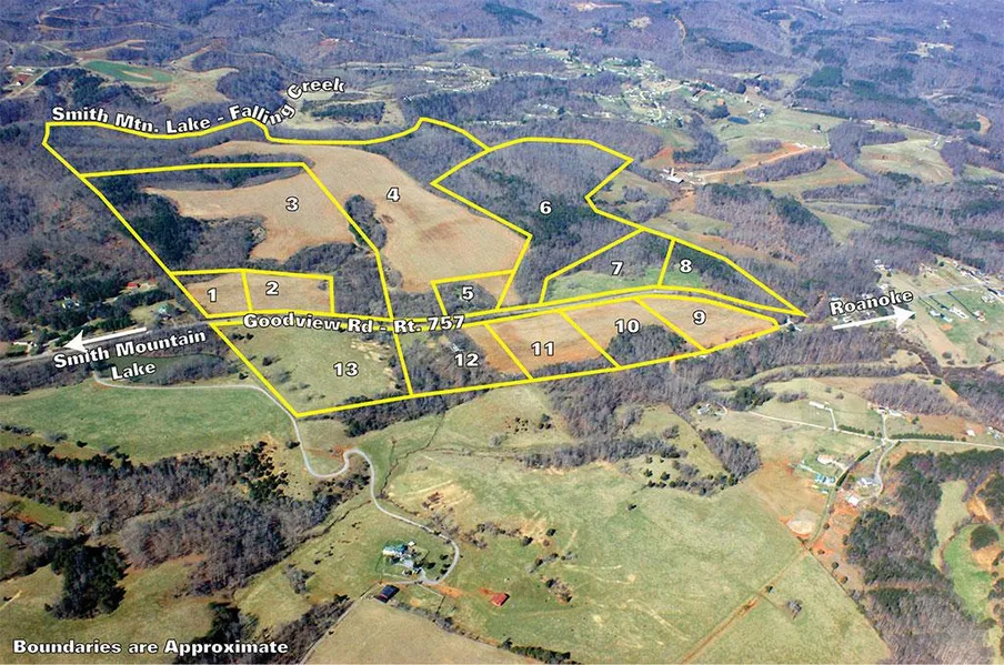 This beautiful Bedford County farm will be offered in 13 tracts from 3.4 ac. in size to 128.4 ac. This prime location is less than 10 miles from downtown Roanoke and offers extensive frontage on both sides of Goodview Rd./Rt. 757. Features include cropland, pasture, woodland, 2-story brick home and frontage along Falling Creek and Smith Mountain Lake at their convergence.