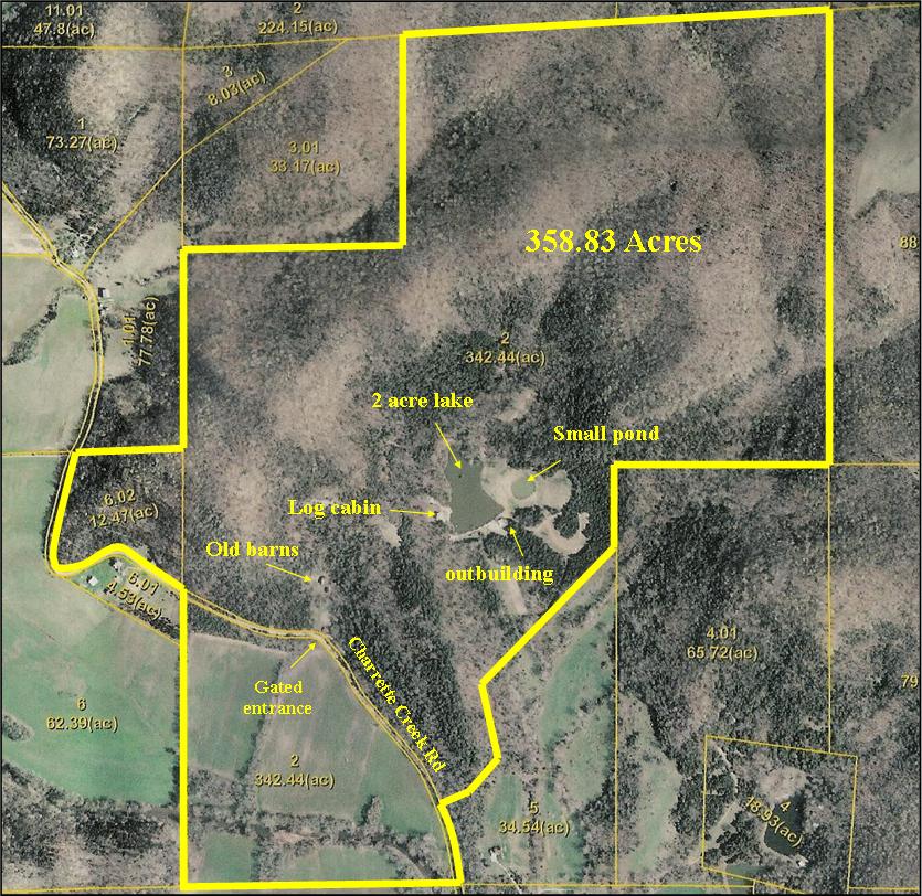 358 acres of beautiful secluded country! Mostly wooded acreage, opening to a 3 bedroom rustic log cabin overlooking a gorgeous 2 acre lake. Cabin offers a wood-burning fireplace and a wrap-around deck, perfect for enjoying the beautiful views. Plenty of recreational opportunities including fishing, canoeing, hunting, hiking, and riding ATV on trails throughout property. Perfect property for a weekend retreat! A picturesque setting you have to see to believe!