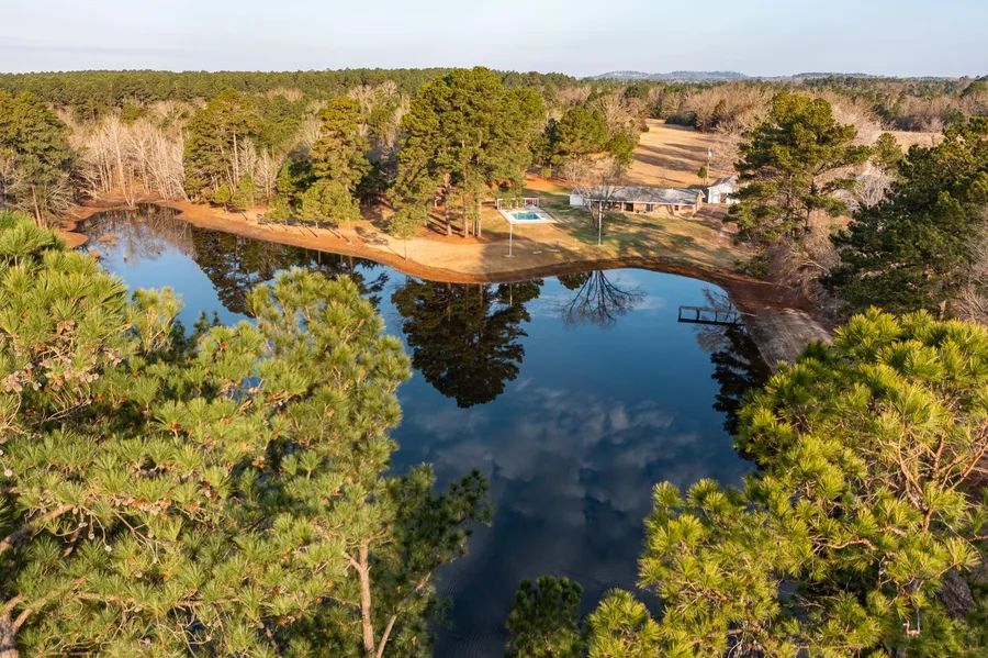 Patterson Ranch is a well-manicured 153-acre ranch estate located in a prime location of East Texas with an updated three-bedroom, three bath, 3200 square foot home that is very secluded sitting at the back of property 3000 feet off the main road that boasts spacious living room with vaulted ceilings, large kitchen/dining, large bedrooms and bonus room that could be converted into additional bedroom and swimming pool all overlooking a 3-acre scenic lake stocked with multiple species of fish. Includes an 1100 square foot shop/open barn with 30-amp RV hook up. The acreage boasts 35 acres of improved pasture for hay production with remainder of property in mixed timber showcasing 4 miles of riding or walking trails leading to multiple deer blind locations. This beautiful, well-known property is located just 4 minutes from Gilmer and 12 minutes from Longview with shopping, hospitals, local and regional airports. Home is on a 500 foot deep well with new pumps recently installed. Community water runs along the entire road frontage with water pipe ran from entrance to home and could be connected. The deer and other wildlife are plentiful on this exquisite property. This ranch offers many opportunities for diverse use as a recreational, cattle or horse operation, or high fence game ranch. The property could be very easily subdivided for multiple home sites or subdivision if the buyer was so inclined to do so.