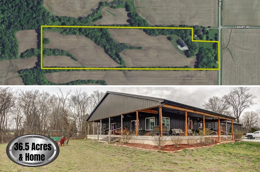 This is an excellent find!!!! This 4 bedroom 2 bath barndominium was built in 2019 and sits on 36 acres of a tillable wooded mix. This 50 x 110 structure allots 50 x 60 to storage/toy space (otherwise known as a garage, but big enough to store a camper) and then 50 x 50 is built on a crawl space and is finished in comfortable cabin living with rough cut cedar and poly vinyl plank thru out. There is a large great room with a vaulted ceiling - this space is the kitchen, dining room and livingroom. There is also a master suite with a master bath and walk-in closet. The home has an excellent wrap around porch to enjoy and watch the wildlife on the 36 acres of land. Excellent deer, turkey and mushroom hunting.