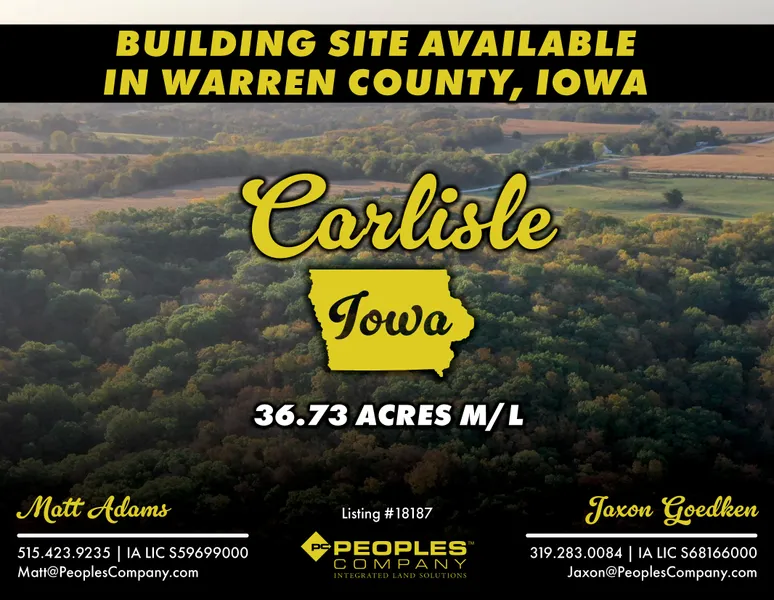 Research Parcel InformationFrom the intersection of Highway 5 and Scotch Ridge Road in Carlisle, Iowa head southeast on Highway 5 for 3/4 of a mile until you reach 165th Place then turn right (south). Proceed south on 165th Place for approximately 1.5 miles until you reach Clark Street. Turn left (east) on Clark Street and proceed around the curve, where the pavement ends Clark Street transitions to 170th Avenue. Continue straight on the gravel for 3/4 of a mile, look for Peoples Company signage.