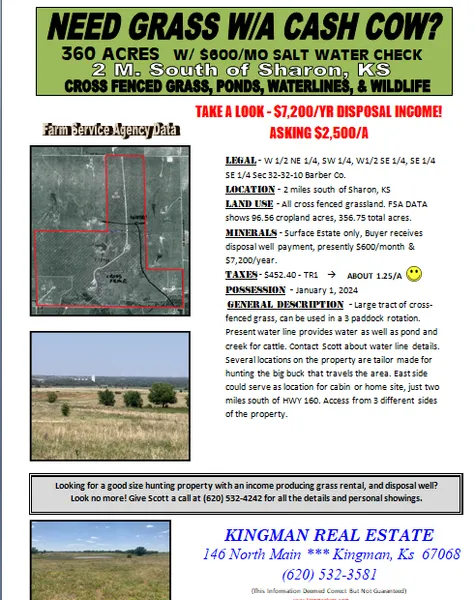 General description - Large tract of cross-fenced grass, can be used in a 3 paddock rotation. Present water line provides water as well as pond and creek for cattle. Contact Scott about water line details. Several locations on the property are tailor made for hunting the big buck that travels the area. East side could serve as location for cabin or home site, just two miles south of HWY 160. Access from 3 different sides of the property.