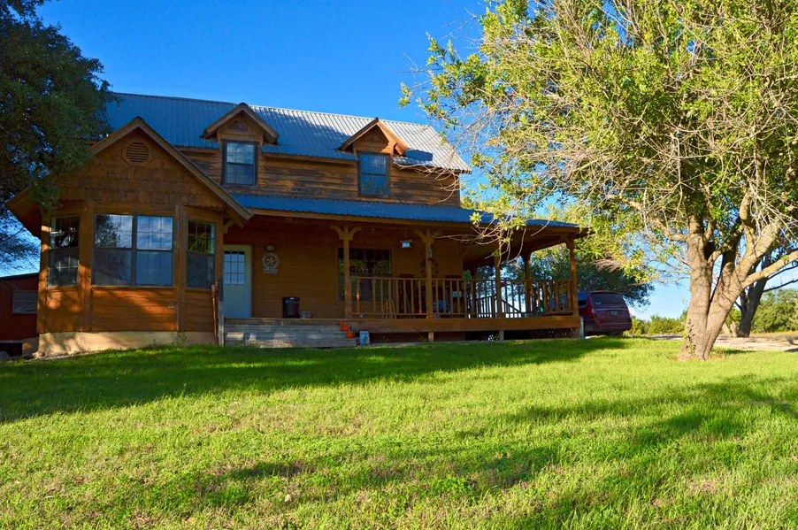Great little ranch with good cover, beautiful oaks. Drive down a winding road with gorgeous oaks on either side to the beautiful rustic home with a large wrap around front porch! You can kick your feet up here!! Home has beautiful woodwork!! Large living with wooden beams on ceiling, custom wood (real wood) floors in dining and kitchen! Great office for a work at home person or a wonderful set up for extended family. Large oaks in the yard, hill country view from large front porch! Beautiful place to raise a family! Good small town school. Great place to retire, have a garden, bring the horses, raise a few calves or dorper sheep. Has a large storage building, a large metal shop or barn. Property is cross fenced and seller has material for new front fence. Property has two stock tanks and good cover for deer, turkey and other wildlife.