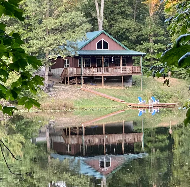 Truly an exceptional property! A secluded 2BR/1BA Cabin on a tree-lined private lake. The cabin is a newly built (2013) with all the modern amenities including a full kitchen with a side-by-side refrigerator, electric stove and dishwasher. It has an open floorplan with a beautifully rustic interior including reclaimed barnwood and corrugated metal vaulted ceilings. The cozy living room has a wood-burning stove, knotty pine walls with large windows that provide a gorgeous view of the lake. The private bedroom and bathroom are located on the main floor. The second bedroom is in the loft. The Laundry area comes with a high-efficiency front loading washer and dryer. With central heating and air, excellent insulation and exceptional lighting inside and out, this cabin offer...
