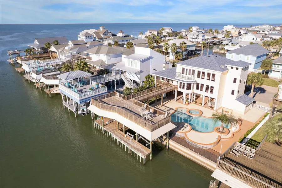 Stunning home on a double lot,situated on the bay and canal. This thoughtfully designed waterfront home, with rare passenger elevator, featuring breathtaking sunset views,expansive outdoor living,and a highly functional layout designed for effortless coastal living. Wood, tile and carpet flooring. Spacious family room opens to the kitchen featuring a Sub-Zero refrigerator,recent appliances,excellent storage,and walk-in pantry. Three bedrooms and two baths are located on the main level, including a bunk room. The primary suite,on the 3rd floor,includes a private balcony, two large walk-in closets,and a beautifully renovated bath with a soaking tub. Two extra rooms can serve as additional bedrooms,allowing the home to comfortably sleep 12–14. Outdoor highlights include a resort like pool,hot tub,3 storage rooms,and an expansive deck with million-dollar views. Boating amenities include a dock (3–4 years old), jet ski lift with remotes,boat trailer parking & a neighborhood pier across the canal.