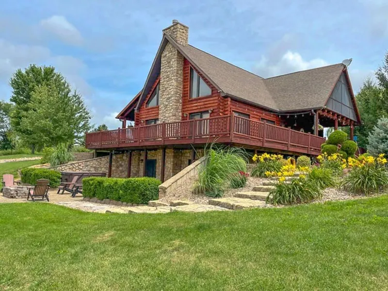 Beautiful 4-bedroom, 2.5-bath log home located in Pike County, Illinois, set on 10.37 scenic acres with a peaceful country setting and room to enjoy the outdoors. Large windows throughout the home provide great natural light and showcase views of the surrounding countryside, while the wraparound deck offers the perfect space for relaxing or entertaining. The updated kitchen features ample cabinetry, counter space, and a large island, making it ideal for gatherings and everyday living. The remodeled primary bathroom includes a custom tiled walk-in shower with glass enclosure and tasteful finishes that complement the character of the home. Outside, the property offers excellent recreational and hobby-farm potential with a heated in-ground swimming pool, spacious patio area, and a private pond. A 24' x 45' pole barn with concrete floors provides plenty of space for equipment, storage, or workshop use. The blacktop driveway and professional landscaping complete this well-maintained property. This Pike County acreage offers privacy, usable land, and well-thought-out improvements-perfect for those looking for a country home with modern updates and room to spread out.