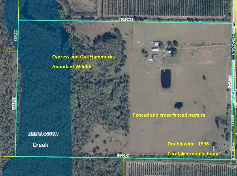 101+/- acres of pristine old Florida! This property is about 50% pristine fenced and cross fenced pasture with a large storage barn, a 3 bedroom, 2 bath 1996 double-wide mobile home (currently occupied by the property caretaker) and the original but dilapidated 1911 homestead. The other approximate 50% is also fenced and consists of hardwood Oak and Cypress Hammocks, the Bee Branch Creek meanders through the West end of the property, and is teaming with area wildlife, including turkeys, wild hogs, white tail deer etc. With the current agriculture tax exemption the property taxes are ONLY $1,818 Properties like this are a rare find, schedule your appointment to see it today, before it's gone!