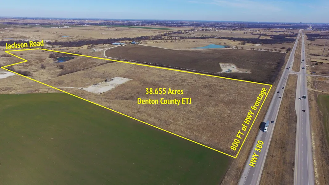 This 38+ acre tract has over 800 feet of road frontage on HWY 380 and approximately 455 feet of frontage on Jackson Road. Property is located in the Denton County ETJ. Krum ISD. Great investment for future development or come build your dream home overlooking the 1+ acre pond! There are a lot of different opportunities with this tract of land. Give us a call today for more information. More land available upon request.