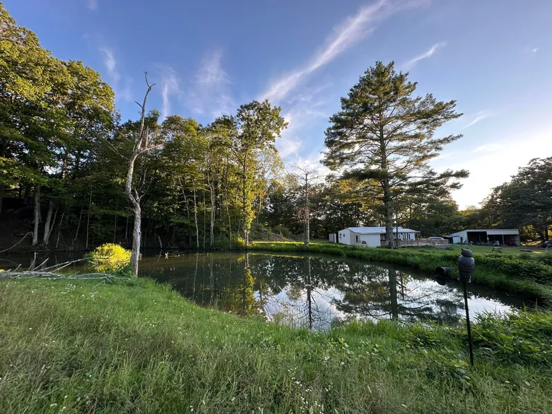 Escape to a cabin & 77+ acres of Natural beauty featuring a gorgeous spring-fed pond stocked with trout, carp, bass. This rare property offers the perfect balance of open farmland (approx. 20 acres) and serene woodland teeming with wildlife. Enjoy sweeping views, total privacy, and yet be only 3/4 mi. off Rt. 219/Seneca Trail. A cozy 1-bedroom cabin/camp welcomes you with a warm, inviting living/kitchen area and laundry/mud room. Recent updates include a newer septic system and a new tin roof—making it easy to maintain or winterize for seasonal use. The land itself is rich with fruit trees, blackberries, mushrooms, and abundant wildlife. Outbuildings include an equipment shed and several well-kept storage barns, perfect for preserving the farm's organic harvest—maple syrup included!