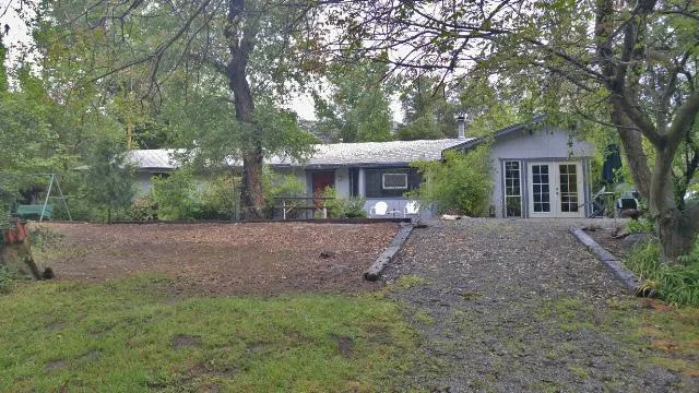 You cannot see this property from the road. The driveway drops down from the road where it crosses the creek and takes you to the residence. The absolute lushness of the surroundings will fill your senses. The custom home was built in 1988. It offers 2,224sqft with 3 bedrooms, 2 baths, living room, huge country style kitchen, and a large family room with a corner wood stove. The kitchen has granite counters and both the kitchen and family room have Spanish paver tile floors. The home is very well maintained with a variety of designer touches.
