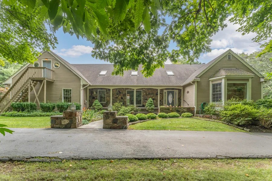 Spectacular Custom Home on 2+ Acres of Private Paradise! Welcome to this one-of-a-kind, custom-designed home nestled on over 2 acres of serene privacy. Upon arrival, you're greeted by the stately stone front and inviting blue slate walkway leading to a charming covered porch. Step inside to a grand double-story foyer with a sweeping rounded staircase, accented by a stunning chandelier and luxurious marble flooring. The impressive floor plan features a large eat-in kitchen, perfect for entertaining, boasting double ovens, a walk-in pantry, dual breakfast bar areas, and abundant cabinetry for all your storage needs. The kitchen seamlessly flows into the cozy family room and light-filled sun porch, offering picturesque views of the back deck, hot tub, and sparkling ocean-blue pool. Formal dining and living rooms provide elegant spaces for gatherings, while a dedicated home office/den, convenient laundry area, and two half baths complete the main floor. The upper level showcases generous-sized bedrooms, an additional home office with a separate exterior entrance (easily convertible to another bedroom), and two full bathrooms. The primary suite includes a walk-in closet, and every room is bathed in natural light from oversized windows and fitted with plush wall-to-wall carpeting. Above one of the three-car garage bays, discover a private apartment with its own entrance, offering a cozy living area, fully-equipped kitchen, 2 bedrooms, and full bathroom. In total, the