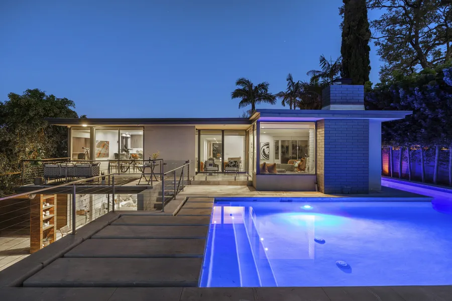 An architectural statement by acclaimed mid-century architect Paul Wuesthoff, this 1962 masterpiece is discreetly positioned at the end of a coveted Beverly Ridge cul-de-sac. Privately sited on over a quarter acre, the residence commands sweeping jetliner views and showcases the effortless glamour of true California modernism. Expansive walls of glass dissolve the boundary between interior and exterior, framing cinematic sunsets and lush terraced grounds. At the heart of the estate, a striking central courtyard introduces an extraordinary wraparound poolan architectural focal point that begins within the courtyard and continues along the residence into the backyard, creating a seamless indoor-outdoor living experience rarely found at this price point. Designed for refined entertaining and tranquil daily living alike, the home offers multiple outdoor vignettes, including elevated seating ...