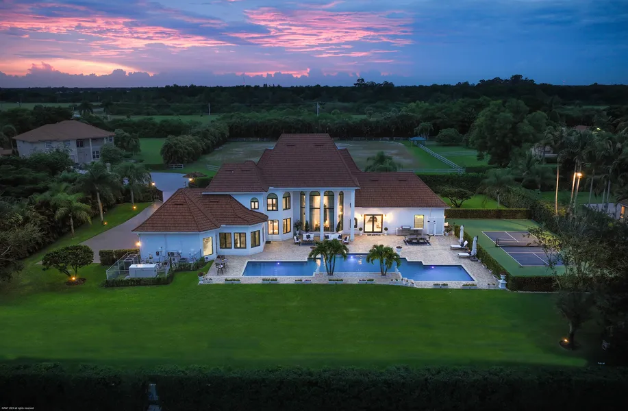 Luxurious French Tudor estate in Southfields, a short golf cart ride to equestrian venues. Completely renovated estate with 6,600 sq. ft. driveway with fountain. Grand entrance with pillars with white marble. New hurricane doors, windows, gutters and irrigation systems. Whole house Generac generator. Open floor plan, 30 ft vaulted ceilings for endless views of Polo fields. OMEGA Kitchen, waterfall marble island, built in Thermador appliances. Features 4 bedrooms, 4.5 fully remodeled baths, and 5 car garage. Presidential wood paneled office with fireplace. Oversized saltwater heated pool. Fully paved 3500 sq. ft. pool deck with seating for 20. Full Outdoor Kitchen, steel shed, full size Pickle Ball Court. Smart home, Audio Video System, Alarm, Sonos surround sound, and much more!