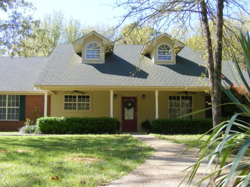 Surrounded by East Texas oaks and landscaping, the yard is easy to maintain and features multi level deck with hot tub in the backyard.