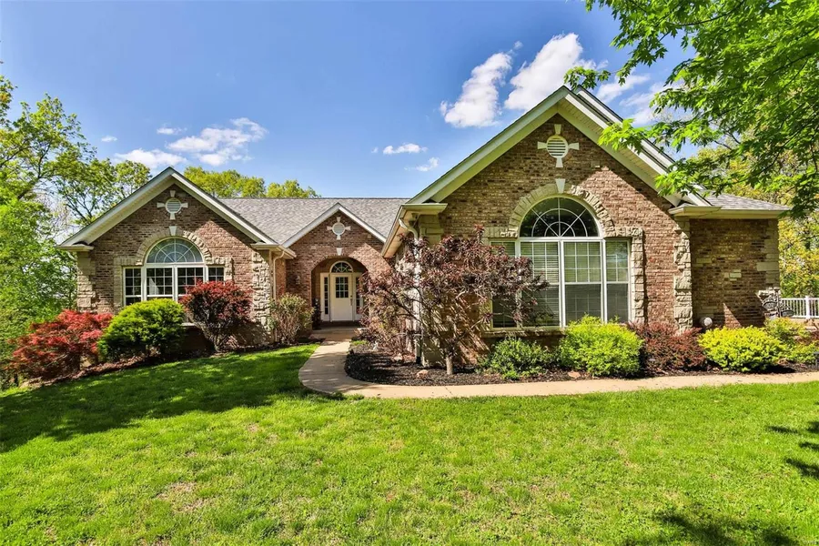 Discover peaceful living in this updated 4 bd, 2.5 bth, 3 car gar atrium ranch located in Huntington Trails on 4 acres with approx. 4000 sq ft of living space. A large welcoming foyer leads you toward the open floor plan showcased by a vaulted great room w/ fireplace, the large open kitchen & breakfast rm that all enjoy the dramatic view. The oversized wrap around deck is perfect for watching nature in your own private yard. The split bedroom floor plan provides a relaxing primary suite. The bedroom & bath enjoy windows that bring light & beautiful views. The primary bath has dbl sink, whirlpool tub & separate shower. Additional bedrooms share a hall bath. The walk-out lower level provides a sleeping room, bath, exercise room & a wonderful wet bar for entertaining in the wide open media/recreation rm. Step outside to your private oasis. Don't miss the other features:solid surface counters, newer roof 3/24, Cul-de-sac, shed, Jeff R-VII Schools, upgraded decorative elements throughout.