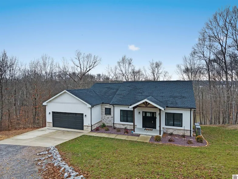 Year-round residence or vacation getaway with short-term rental opportunities! This newly constructed waterfront home sits on over 4 acres (double lot) and features a private dock with more than 290 feet of shoreline in a peaceful, private cove. The open-concept main level offers vaulted ceilings, a spacious kitchen with quartz countertops and a large island, and seamless access to a covered back deck, perfect for entertaining or relaxing by the water. The main floor includes three bedrooms plus an office, with a split-floorplan layout providing privacy for the primary suite. The modern, industrial-style basement showcases stained concrete floors and exposed painted ceilings, offering endless design potential. A fourth bedroom and third garage/workshop add flexibility and additional storage. And best of all, it's located just minutes from Hwy 68, Devils Elbow boat ramp, and easy access to Kentucky Lake and I-24.