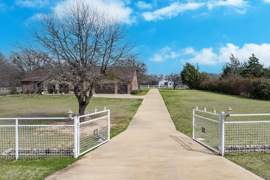 SMALL ACREAGE HORSE PROPERTY WITH UNIQUELY BEAUTIFUL CUSTOM DESIGN! This quality-built 4-3-3 is the builder's own home with luxury high-end finishings throughout. Custom, custom, custom, from the large cedar beams, arched brick & stone doorways, geometric built-ins, chef's kitchen, patterned ceramic tile, designer paint & wall treatments, vaulted ceilings, fully handicap accessible, PEX plumbing & R19-R45 insulation throughout, and the list goes on! Home, yard, and outdoor entertainment pavilion are situated inside heavy-duty pipe hog fencing, securely and conveniently gated front & back. Beyond the back gate is a large pond, perimeter barbed wire fencing, and a 3-stall barn with central concrete path and large storage & tack-room. Close enough to dining, shopping, and highway access to be convenient to the metroplex; far enough to escape the city traffic, noise, and lights. Only a golf cart ride away from nearby King's Creek Country Club where you can golf, dine, play pool or bingo, and sing karaoke at your leisure! Live the ranchette dream life, just bring your horses, goats, cows, chickens, or other livestock. UNIQUE OPPORTUNITY, this property is set up and ready to go!