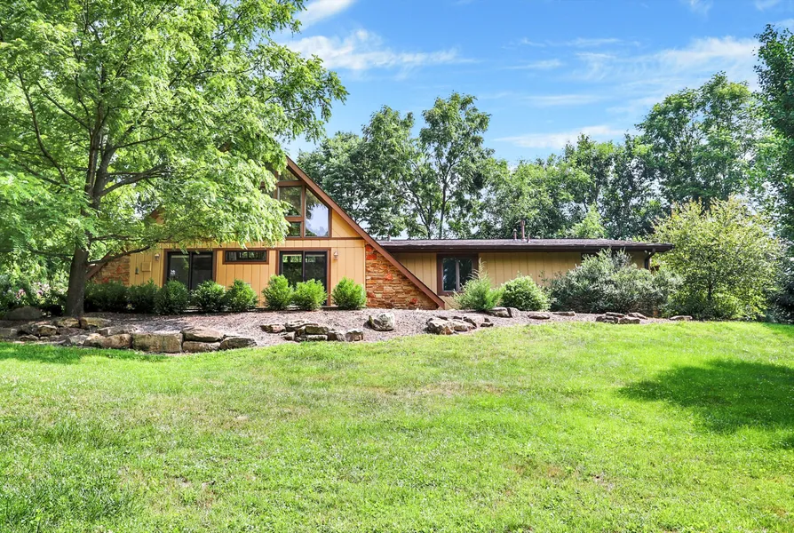 This is it! 4 beautiful acres in the heart of CG & close to everything! Brown County stone, A frame home that exudes charm, tranquility and privacy. This home is fantastic at bringing the outdoors in with the 22 ft vaulted ceilings in the great room with floor to ceiling windows looking north accented by custom woodwork. You'll love all of the natural light, hardwood floors in kitchen, hall and primary bedroom. Outdoors, there is a creek running through the woods, and trails have been made to explore the property. Current owners have planted lovely, mostly native flower gardens, installed a pond, and loved this property for almost 50 years. Detached barn has 220 service, 2 bays, an additional space that is currently a workshop, and a loft.