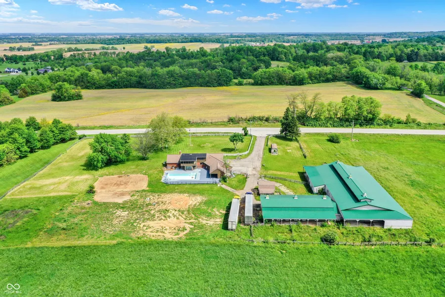 This property includes a modern barn and facility. The indoor arena measures 80x120 and features overhead doors, skylights, and ceiling heights suitable for hunter jumpers. The barn has six heated stalls with automatic watering, a heated wash rack, two tack rooms, ceiling hay lofts, and an office/viewing area that can also be utilized as a residence. A concrete-enclosed storage room could be converted into extra stalls. The north side of the barn offers covered trailer parking with complete hookups. Located just 2 miles from I-65, this home boasts a hilltop view of Columbus, an in-ground pool, a main-floor master suite, two laundry rooms, a spacious sunroom, two fireplaces, and handmade Fox cabinetry.