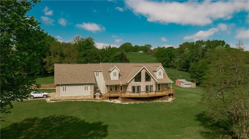 This fantastic home sits on 4 acres minutes from east Fayetteville or Springdale. Features include wood floors in living room, dining room, entry and kitchen, soaring 2 story windows in the living room with a beautiful fireplace, and a second living area upstairs. Kitchen has quartz countertops, lots of cabinets and counterspace, a pantry and a large island. Large master suite includes roomy closet, a whirlpool tub in the bath, and access to the deck. Upstairs bedrooms include one with private bathroom. The 4th bedroom would also make a great bonus/game room. The large front deck is perfect for entertaining and enjoying the view. 30x50 shop building has 2 bay doors, is fully insulated and has an area that can be heated with the wood stove. Lots of room for all your hobbies and toys. The above ground pool shown in photos has been removed.