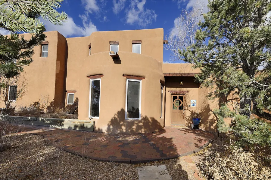 4 bedroom 3.5 bath custom home specifically sited on a pion tree hilltop with majestic views of the Sangre de Cristo mountains. Iconic Santa Fe style featuring brick, wood and tile floors; vigas and latillas; hand-crafted cabinets and doors, and a wrap around portal. In addition to radiant heat, the home features 4 fireplaces plus a woodburning stove for maximum warmth during the winter months. Spacious living room with built-in shelving, picture window, and a curved white brick wall. Separate dining room has French doors which lead to the outdoor portal for expanded entertaining and al fresco dining. Kitchen is appointed with stainless steel appliances, breakfast bar, and a breakfast area with banco seating. Owner's suite opens to an outdoor deck with distant mountain views. 4th bedroom offers flex space as a media room, studio or office. Convenient location with easy access to I-25 and...