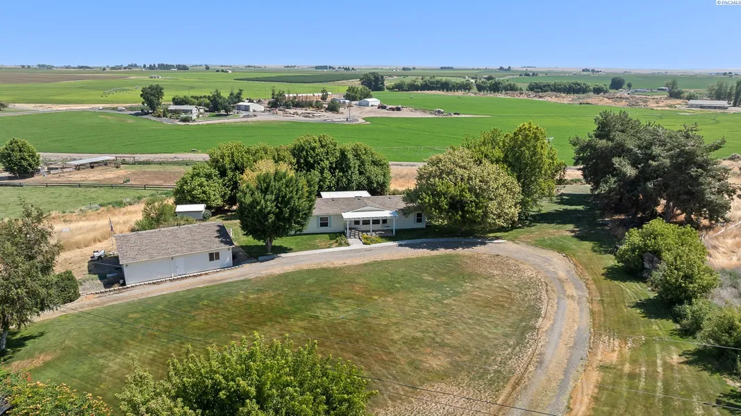 MLS# 286146 Experience serene living with room to breathe! This beautifully maintained 4-bedroom, 2-bath, 1,809 sq. ft. home is perfectly situated on 4.2 acres of private land with a circular driveway and mature, landscaped grounds. Located on a private road, this property offers unmatched tranquility, yet remains just 20 minutes from dining, shopping, and entertainment on Road 68 in Pasco. Inside, the thoughtful split-bedroom design ensures privacy for the primary suite while offering a super functional layout for everyday living. The home boasts both a living room and a great room, with soaring cathedral ceilings in the living, dining, and great rooms that create a bright and open atmosphere. The spacious kitchen is a chef's delight with ample countertop space, abundant cabinetry, a convenient eat-in bar, and skylights that fill the space with natural light. The laundry room is equally impressive with its utility sink, extra cabinetry, and plenty of storage‹”a theme carried throughout the entire home. Step outside to a massive, covered patio‹”an ideal spot to relax, entertain, or simply take in the peaceful south-side territorial views. The property also features a 32x36 shop, already permitted for a bathroom, offering endless possibilities for hobbies, storage, or workspace. With its combination of privacy, convenience, and stunning natural surroundings, this home is the perfect blend of peaceful country living with easy access to modern amenities. Ready to see it? Schedule your private showing today!