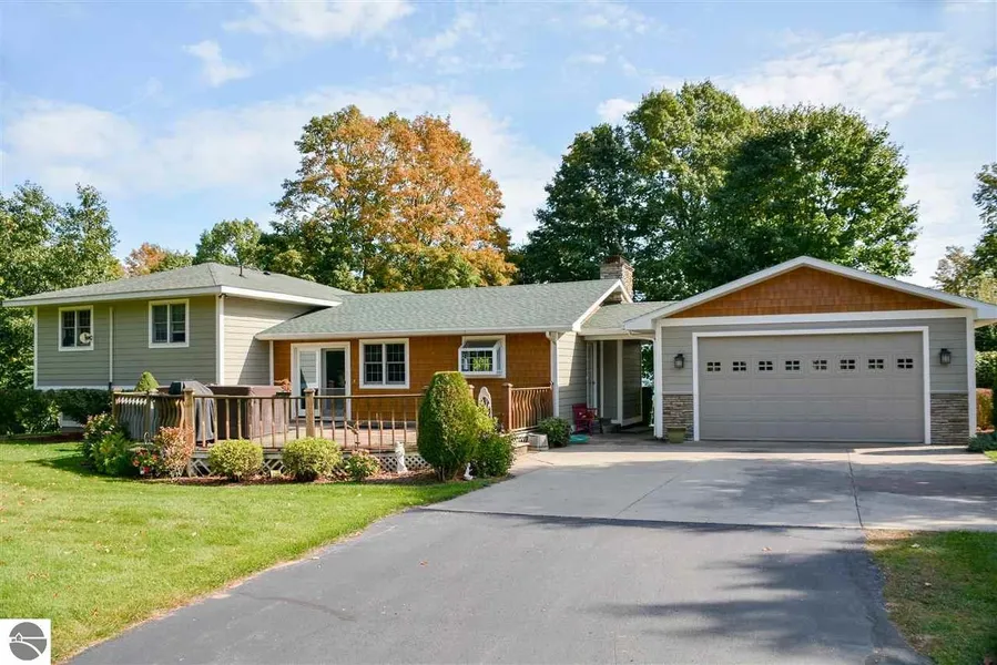 West Grand Traverse Bay views! Enjoy the waterfront drive to this beautifully maintained home situated just off of world famous M-22. This well-appointed custom tri-level in Leelanau County offers beautiful peek-a-boo water views from almost every room in the house or from the expansive front yard where you will never tire of the gorgeous sun and moon rises over the bay. In the spacious backyard, a sunny southern-facing deck complete w/ hot tub is the perfect place for BBQ's or to open sliders and add extra entertainment area to the adjoining kitchen/dining room area where surround sound is wired in & ready to go. The main level features a bright & open floor plan, sunken living room w/ vaulted ceilings & floor-to-ceiling gas fireplace, island kitchen w/ stainless appliances, custom coffee bar & built-in 2-drawer refrigerator for extra beverages, marble counter tops, custom cabinetry & back splashes, large walk-in pantry, hardwood floors, and plenty of natural light. A half flight up leads to the master bedroom w/ private bath, two additional bedrooms, and another full bath. A half flight down from the main level is a spacious family room w/ timeless cedar trim, two bonus rooms, and an ample unfinished space for a workshop or additional storage. Attached 2-car garage has a covered breezeway perfect for a water view greeting as you pull in the driveway. The amazing & versatile adjoining lot included in this listing has 60' of across the road private frontage and is available to purchase w/ this property for a combined 4.2 acre estate or is for sale separately (see additional MLS). The vacant lot has multiple potential build spots including fantastic water views from the western portion of the property & can be accessed by Crain Hill Rd or M-22. Less than 6 miles from downtown Traverse City, 8 miles to Sutton's Bay, & close to vineyards, boat launches, golfing, and all the best of the county.
