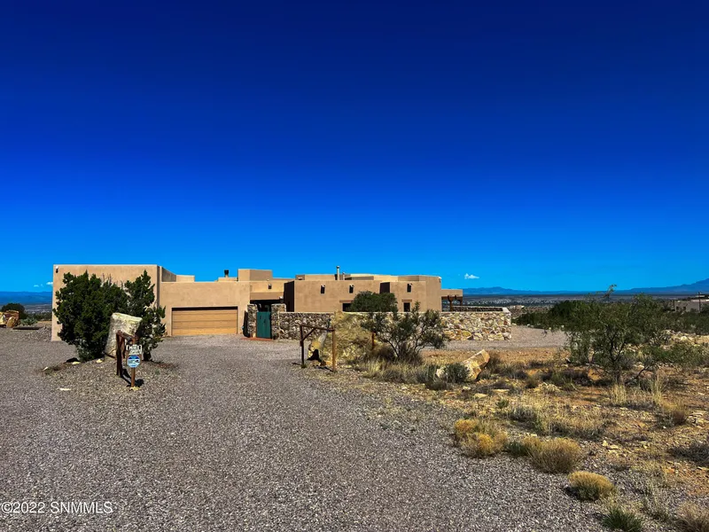 This majestic home is a true desert charm. Situated East of the lake and on the way to Spaceport America, the tranquility of this location is a dream come true. The high courtyard walls provide a sanctuary at home. The gated entrance adds a pop of color to the scenery. Enter the home to find incredible vigas, wood work, arches, a kiva fireplace and thoughtful design. Constructed with a focus to the view and natural light that floods the home, it's easy to feel connected to nature. The 3 bedroom, 3 bathroom home itself is stunning. An art studio connects the home to the garage which includes an attached pull through double RV garage. The wraparound porch is the perfect place to enjoy a desert thunderstorm.