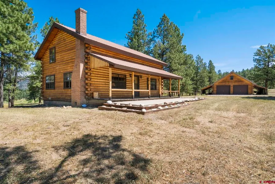 This is the first home built in Deer Valley Estates and has been in the same family for nearly 40 years. Built utilizing a D-Log design that maximizes the inherent energy efficiency of a log home, this lovely cabin has a wonderful open design with a well appointed kitchen and dining area that opens to a comfortable living room with tall vaulted ceilings and a super efficient Federal Airtight wood burning stove. There is a large bedroom and full bath on the main living level as well as a big laundry and storage room that has access to a side deck for convenient access to firewood. The huge covered front porch is over 1,000sqft and is the perfect place to relax and enjoy cool Colorado summer days and watch dozens of hummingbirds feed at the multiple feeders. Upstairs is a huge loft, double walk in closet and bath that serves as the primary suite. There is another large room upstairs for additional sleeping quarters, office or bonus room. The home sits proudly on the high point of the gently rolling 4+ acre property providing great views of the surrounding Ponderosa Pine forest and mountains beyond. There is a 900sqft oversized detached two+ car garage with tons of storage space in the attic above and on the sides of the garage. Deer Valley Estates is a gated community surrounded by over 11,000 acres of National Forest and provides multiple points of access to community members for hiking, biking, horseback and ATV riding. Bayfield is just 10 miles to the west, Durango is 25 miles to the west and Pagosa Springs is 35 miles to the east. Deer Valley is horse friendly and has been recognized by the National Fire Protection Association as a Firewise Community. Fiber optic is recently installed throughout the subdivision for highspeed internet.