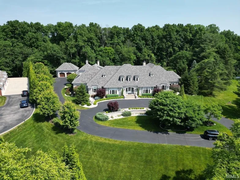 Stunning limestone artistry surrounds you in this custom home on over four acres in this estate home in Stoneridge. The beautiful stone work and craftsmanship honors the local industry in this custom design with privacy. Solid wooden doors, high caliber finishes, hardwoods, stone fireplaces, a custom kitchen and gathering area are all highlights of this home with a library and wood paneled study that includes media area and recreation features. The circular plan flows to two main level studies and views of professional landscaping and privacy. The primary suite wing on the eastern side of the home features access to the courtyard and true spa features with soaking tub, ceramic shower with jetted features and a swim spa access. The suite features a dedicated gym and study area, primary laundry, storage built-ins and two dedicated dressing rooms with custom furniture quality built-in cabinetry. The kitchen is the heart of the home and features double islands with professional Wolf cooktop and double ovens, custom walk-in pantry, plus great access to the formal dining room with Butler s pantry and wet bar. The breakfast room has courtyard access plus flows into the screened family room with beautiful stone fireplace and courtyard views. The West wing of the home has two additional bedroom suites on the main and a dedicated laundry area with fantastic storage. There are two powder rooms on the main level for guests and for owner convenience. There is an upper level bonus room that serves as a dedicated suite with a kitchen that is perfect for long-term guests. There is an attached three car garage and also an additional two car detached garage. There is beautiful natural light throughout this home and superb site lines from every angle. For convenience, this home has an elevator that accesses the upper level bonus room and also to the lower level living space. The lower level has a wonderful study guest area and access to the beautiful wine tasting room with custom wooden paneling. There is wonderful finished and unfinished storage in the lower level that s perfect for off-season items. Beautiful mature trees and a lovely drive over your bridge creates a relaxing atmosphere that allows your day to melt away as soon as you pull into the home. This pristine home has had wonderful care and is built like an institutional structure for years of enjoyment. Stoneridge is one of Bloomington s most beautiful communities.