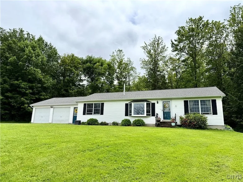 Tucked in up on the hill, this sweet ranch sits on a BEAUTIFUL 4.26 acre lot with gorgeous views. Simplify with one-floor living, but with extra potential space in the basement. The kitchen is freshly painted with new floors and opens to the dining area and huge living room. The living room gets the best views out the big front picture window... while also being cozy with a nice pellet stove. One end of the house is the primary suite, with nice closet space and an attached full bath. The other end of the home has 2 more large bedrooms and another full bath- recently remodeled! The attached garage is so convenient and it walks into a convenience mudroom/laundry room before entering the kitchen. There are sliders from the dining area to the big back deck- surrounded by mature trees giving a lush, private setting for grilling or entertaining. Just a short drive into the heart of Cazenovia and located in the award-winning Cazenovia school district. A little piece of country tranquility is waiting for you! *Showings start Wed. July 2nd*