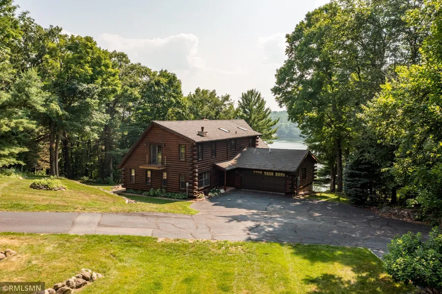 Exceptional custom log home nestled on 4.2 wooded acres and 230 feet of lake frontage on beautiful Turtle Lake! Commanding water views from almost every window as well as the oversized wrap around deck. Main floor gathering room features a large stone fireplace with open floor plan, gourmet kitchen, and dining. Ideal for entertaining! Top floor area features primary suite with fireplace, walk-in closets, large bathroom, office, and private balcony. Lower level walkout with another fireplace, game room, laundry room, and exercise/storage room. This property is truly magnificent!