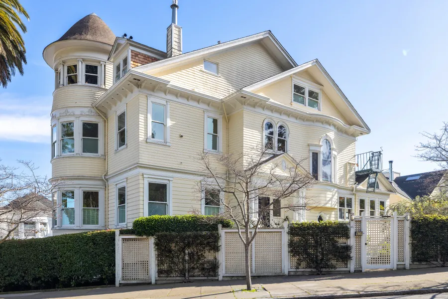 Unique fully detached country estate in the heart of San Francisco. This historic grand-scale 1886 Victorian mansion is flooded with light with windows on all four sides. Behind a gated entry, the house sits in extraordinary private gardens on an oversized corner lot facing Buena Vista Park. Behind the 55 ft. handsome facade is a fabulous flexible floor plan offering many options for informal family living with modern livability and large-scale entertaining. The spectacular large remodeled kitchen has a huge island, windows looking to the gardens, a vaulted ceiling and skylight, tons of storage and built-in banquette seating. The expansive main floor--over 1,800 sq. ft.--has a large living room with curved bay window, formal dining room, family room, media room/office and guest bath. Architectural details include soaring ceilings, walls of windows, three fireplaces and built-in bookcases and china cabinets. From the central entry foyer a grand staircase leads upstairs. The dramatic three-panel-stained glass window over the staircase streams with light. On this floor there are four bedrooms, two baths and a laundry room. The top floor features a spectacular 1,000 sq. ft. primary suite with sweeping city views and outlooks to park greenery. There is a sitting area with southern outlooks, a contemporary gas fireplace, two walk-in closets, built-in storage and ensuite bath. A private circular office with wrap-around views to the park and the city skyline complete this top floor suite.