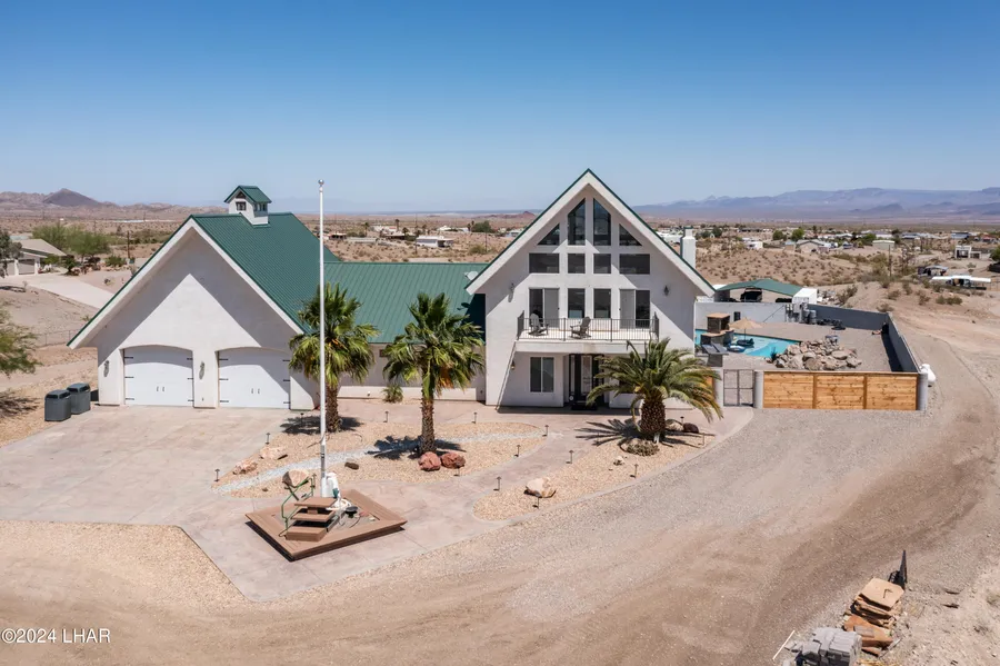 Welcome to the epitome of perfection, where the lifestyle of Lake Havasu City collides with the tranquility of Havasu Heights. This two-story, equestrian, property is sure to captivate with its resort-style backyard oasis featuring a lazy river, swimming pool w/waterfall, putting green, outdoor kitchen, outdoor TV hook-ups, and OWNED SOLAR! This large two-story residence (equipped with elevator) has 3 bedrooms, 3 bathrooms, updated kitchen, stainless appliances, detached 60 x 80 Barn/Toy/RV garage with 16 ft. door and air-conditioned ''guest quarters', large enough for 4 - 8 guests. The front entrance opens to a large great room with windows from floor to cathedral ceiling. The primary bedroom w/ensuite and secondary bed/bath combo are conveniently located in the hall off the kitchen. Take the elevator to the second-floor loft formerly used as the third bedroom, but now hosts a pool table, arcade games, bar and comfortable TV/couch space and is perfect for entertaining. French doors open to the second level balcony with exceptional views of the mountains. The detached garage or toy barn currently fits a 40ft. boat, 50ft. RV, and pontoon. This is truly one-of-a-kind!