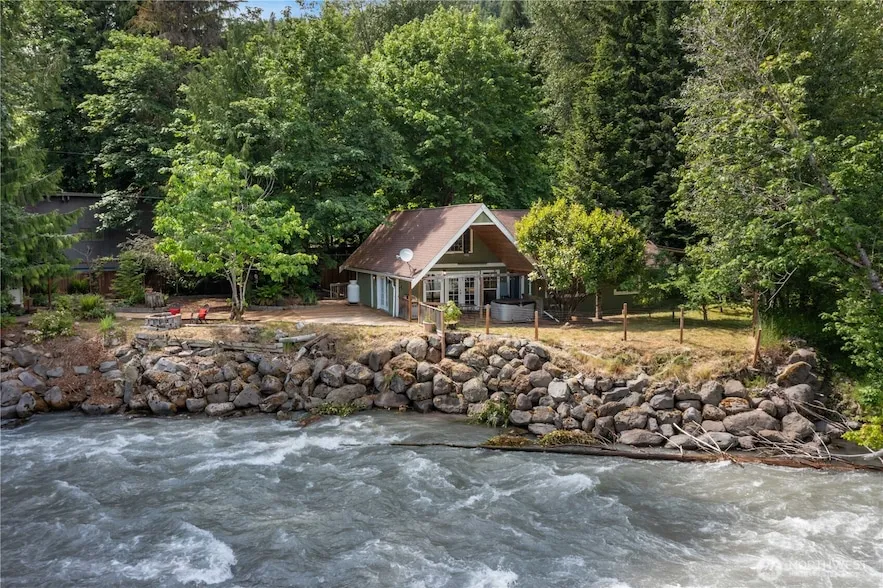 Great new price & time to get in before the Crystal Mtn 25-26 ski season begins. 4.39 level acres in Greenwater, 19 miles to CM Resort. 3 Bed/2 Bath home, positioned on the bank of the White River, has been a popular vacation rental. Generous primary suite & bedroom on main level. Addt'l bedroom, bonus room & nook upstairs, can easily sleep 10. A substantial patio & boardwalk winds thru a private garden, leading to a 148 SF art studio/office w/ garden shed. Tranquility at your doorstep. If you like relaxing to the mesmerizing sound of a river while soaking in a hot tub or chilling out in the mountains after a day on the slopes & trails, then this is the place for you! Partially fenced meadow has power for RV, septic connection. Auto Gen.