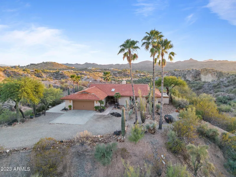 Located in an Exclusive Peaceful Area with Beautiful Views of the Surrounding Mountains. Covered Patios And Inviting Surrounding Pool Patios. You'll Enjoy a Custom Heated, Saltwater Swimming Pool with Waterfall & Fountain. Wander Over to a 1150 SF 3 Car Garage with Casita or Multi-Purpose Room for Your Favorite Indoor Activities. Attached is an Approx 250 SF Work Shop. Both with Mountain Range Views. There Is Room To Bring Your Horse On This 4.47ac Property. Enjoy The 3 Bedroom Plus A Convenient Office Room. Another 2 Car Attached Garage. Inside Your Private Gate you'll Have Room for RV & More. Custom Shed For Your Stuff Or Tack Room. Newly Painted And With Showcase Saguaro's. A Gated Property