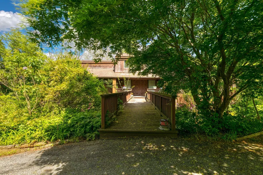Opportunities like 13915 Green Branch Road are seldom available in todays day and age. Inspired by Frank Lloyd Wrights designs with elements of his classic blueprints found throughout the home, this mid-century modern style home transports guests to the gilded age of design. A bridge over lush landscaping welcomes you home as a unique element found at only a handful of homes in Maryland. Bring your cosmetic inspiration to update this light filled home to your desired specifications. The open main floor layout is open yet still allowing for designated living & dining spaces, and has a light filled loft overlooking the living room & backyard. Each level and nearly every room has access to a balcony all overlooking the surrounding preserved forest which backs to Hunt Valley Country Club. The primary suite is overly large even for todays standards, and an easy to adjust layout allows for any remodel to be easily completed. Down one floor find a formal living room or office with another deck as well as the second bedroom and the second bathroom next to the two car garage. The bottom floor features a similar layout with a flex entertaining room as well as two additional bedrooms and a full bathroom. Surrounded by trees farther than the eye can see, the backyards potential is unlimited. A pool and multiple patios are awaiting your vision to bring them back to glory and be the envy of The Greenlands in Hunt Valley.