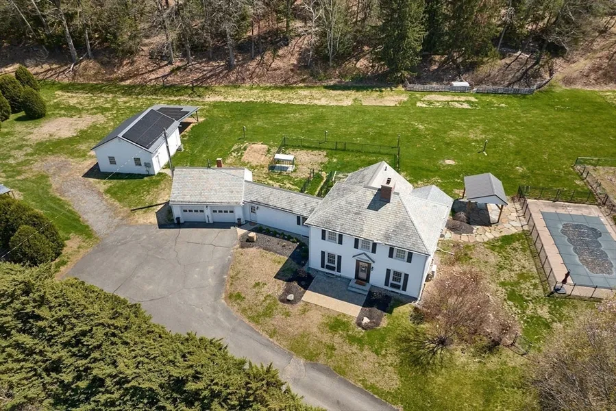 Ready for immediate occupancy! This well-maintained, stately 1945 Colonial home in Sunderland offers views of Mount Sugarloaf. The home boasts three bedrooms, two full bathrooms, hardwood and stone tile flooring, two fireplaces, a heating/cooling mini-split system, and newly installed seller-owned solar panels. The spacious country kitchen features a sunny breakfast nook for culinary delights. Relax in the three-season sunroom or enjoy the Goshen stone patio and in-ground pool. Embrace your imagination on the 4.7-acre property, which is ready for gardens or animals. Additionally, it includes a four-season, heated and air-conditioned workshop. Conveniently located, the home is within minutes of UMass, Amherst College, and I-91.