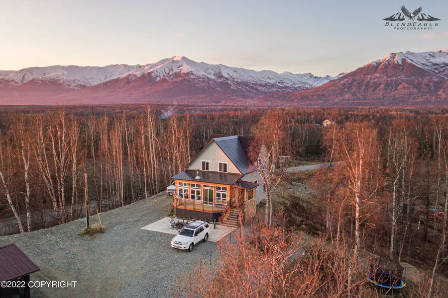 Palmer charm at its finest. 4.7 acres list with the cutest house! MAJOR upgrades this year in 2022. The views from the house and yard are spectacular. Sit in you Alaskan built/ European modeled sauna in your own yard. Back lot has been prepped for a shop and lower land has been cleared with a road put in for access. The potential for the use of that lot is endless.When you walk into the sunroom, you are drawn in by the views and you can warm up with your wood stove, natural light, slate flooring and you are set for the winter night. Continue on into the kitchen with an open concept, new appliances, and large walk in panty. Tall tongue and groove ceilings downstairs gives a very open feel. Downstairs features a guest room while the upper level has three bedrooms, an bath, and tiled laundry room Bones are good. Built in 2015 The entire home had been insulated in 2018, septic and leach fiel...