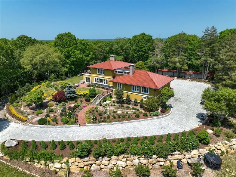 Nestled atop a serene hill and accessed via a charming woodland road, Odiseya Estate is a private, eco-friendly Mediterranean villa offering unparalleled luxury and sustainability. This meticulously renovated residence features five spacious bedrooms, each with its own en-suite bathroom, and two well-appointed kitchens. The home's thoughtful design includes a sunroom, exercise room, and exquisite finishes such as Venetian plaster in the grand and dining rooms, cher/teak wood floors, and triple-pane windows. Sustainable features abound with a Spanish barrel roof, Stucco exterior, custom copper gutters, and energy-efficient heat pumps. The master suite is a true retreat with cathedral cedar ceilings, a private balcony, an extraordinary bath, and a walk-in closet. Set amidst beautifully landscaped hills and valleys, the estate boasts a tennis court, gazebo, terraces, and a patio with an outdoor barbecue area. The surrounding gardens include a kitchen garden, a heated greenhouse, an orchard with 50 fruit trees, and a diverse berry garden. Additional features such as honey hives, mushroom cultivation spots, and an efficient irrigation system enhance the estate's charm. Offering both seclusion and proximity to beaches, golf clubs, and downtown Westerly, Odiseya Estate presents an exceptional opportunity for luxurious living, with potential for use as a Bed & Breakfast or for private events. Video & Matterport available.