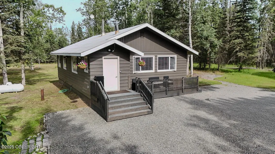 Tucked away in the woods, just minutes away from the Kenai River, this beautifully renovated home offers the perfect mix of modern comfort and timeless charm. Thoughtfully updated inside and out, the home also includes a bonus office/utility room, providing extra flexibility for remote work, hobbies, or storage. A standout feature is the impressive 1,000+ sq ft two-story barn-style workshop. With its unique design and ample space, it's perfect for large projects, equipment storage, or could be transformed into a guesthouse or an income-generating rental. Also included are a dry cabin ideal for guests or additional rental potential and a shed for extra storage. Set on three adjoining lots totaling 4.77 acres, the property offers space, privacy, and endless potential. With no CC&Rs, you have the freedom to make it your own, whether you're envisioning a hobby farm, rental property, or a serene homestead. It could even be the perfect horse property. Option to purchase the home furnished including a riding lawn mower and miscellaneous power tools.