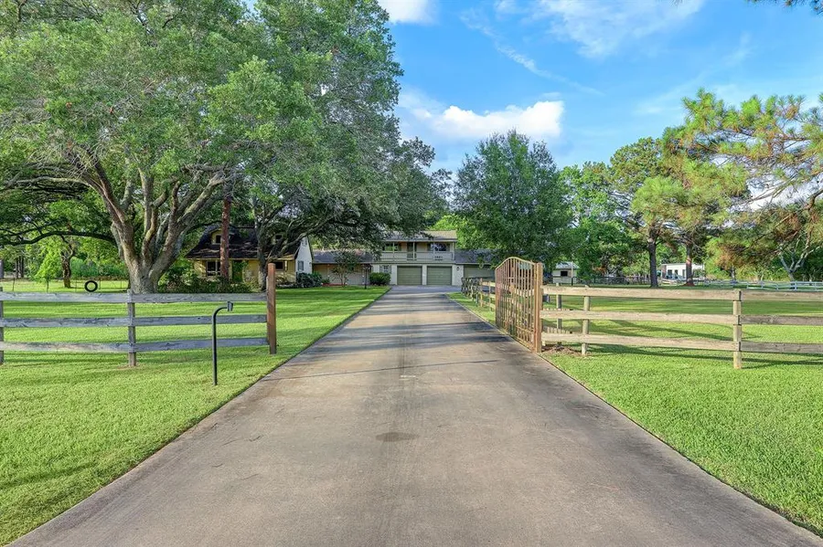 PRIVATE COUNTRY SETTING ON 4.8 ACRES WITH SOARING OAK TREES AND NEARLY EVERY AMENITY YOU COULD WANT! GREAT SPOT FOR HORSES W/A FULLY FENCED PASTURE & 2 STALL BARN W/ ELECTRIC & WATER. WONDERFUL OUTDOOR AREAS INCL THE POOL W/TANNING LEDGE & ROCK WATERFALL, COVERED PATIO W/OUTDOOR KITCHEN, POND & FULLY FENCED PASTURE. THE GATED DRIVE OPENS TO THE MOTORCOURT W/4 CAR GARAGE & BOAT/RV PARKING W/ HOOKUPS. PICTURESQUE FRONT PORCH OPENS INSIDE TO A HUGE ISLAND KITCHEN W/ GRANITE COUNTERS, STAINLESS APPLIANCES & GLASS FRONT CABINETS, WOOD & TILE FLOORS THROUGHOUT, OVERSIZED DEN W/ CUSTOM BUILT-INS & A FIREPLACE W/ GORGEOUS STONE SURROUND, 2 BEDROOMS DOWN W/EN-SUITE BATHROOMS INCL THE PRIMARY SUITE OVERLOOKING THE BACKYARD. 2ND LEVEL W/2 SPARE BEDROOMS & FULL BATHROOM. SPACIOUS GARAGE APARTMENT OR GAMEROOM W/ FULL BATH & FRONT/BACK BALCONIES OVERLOOKING THE PASTURES. CORNER LOT IS APPROX 1.8 ACRES & IS A GREAT OPPORTUNITY TO SUBDIVIDE. LOW TAXES -CLOSE TO I-45 FOR QUICK COMMUTES.