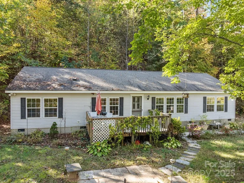 This is an incredible opportunity for any buyer! Located on a breathtaking drive down Pisgah Highway, rests this nearly 5 acre parcel. There is a huge garage shop at the base of the driveway that has totally level access to it. Up a slight climb the primary home sight features level usable yard space and a 3 bed 2 bath home. At the switchback in the finished driveway there is what appears to be an old logging road connection, right there is a level, potential build site and possibly more further up. The home itself is a 1620 square feet modular home with a 2001 build. It needs some TLC but is in overall good condition and was well maintained. Could be move in ready, mortgage worthy, no known major issues. Features a large primary suite and two well appointed bedrooms. It has a nice front deck and a covered carport area out back. Across Davis Chapel Road between 151 runs Stony Fork creek, it can be heard at the shop and throughout the primary build site. This property was not affected be Helene and is not in a flood plain.