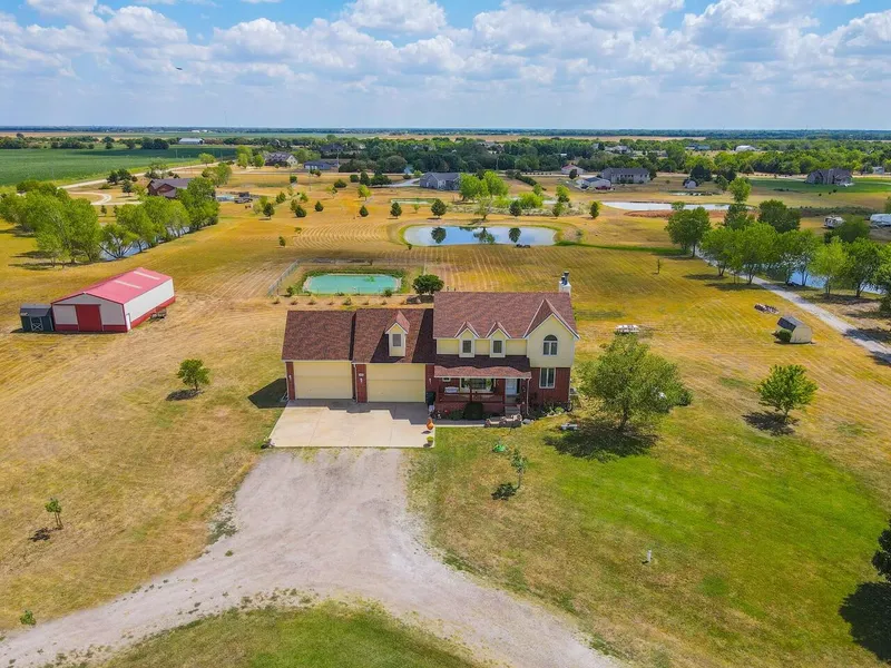 Close to the city with all of the country feels. 5 bedrooms and 3.5 baths, 4 car attached garage, pole barn, pond and all situated on almost 5 acres. Custom-built country estate situated on just under 5 acres just 10 miles south of Wichita! Enjoy country living while only being a few minutes from town. This attractive 2-story - 1 owner home has it all! Exterior Features include: circle drive leading you to the entrance, 30X50 pole barn plus 2 additional storage sheds, 4-car attached garage all insulated, pond, high impact roof replaced in 2018 and barns are allowed. Interior Features include: MAIN FLOOR- formal dining room, formal living room, plus hearth room with a wood burning fireplace, open floor plan for the kitchen and dining room with island, walk in pantry and all appliances transfer, zoned heating and cooling, UPSTAIRS- master bedroom and en-suite with separate shower and whirlpool tub, two vanity sinks, walk-in closet, Laundry room (both washer and dryer transfer), 3 additional bedrooms and a guest bathroom. DOWNSTAIRS- true walk out basement, spacious recreation room with access to the patio, wood burning fireplace, full bathroom, 1 more bedroom. In one of the upstairs bedrooms don't miss the secret hiding/storage in the closet behind the book shelves. Call today for your private showing!