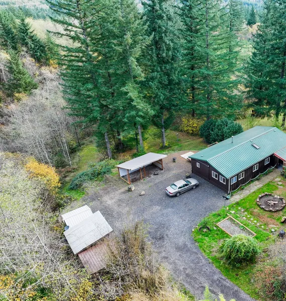 Your very own private retreat. Almost 5 acres of secluded land with an oversized four-bay shop plus covered RV parking and hookups. Additional outbuildings include tuff shed, wood shed and fenced dog run to covered front porch. Ideal setting with close access to Camas school district and town. Enjoy the natural surroundings including blueberries, raspberries, custom fire pit and nature trails. After a day of hiking and biking relax on the back patio to the sound of a year round creek. The house features metal roof, forced air, new water heater, new well pump and new tie-downs, open floor plan, vaulted ceilings just waiting for your personal touches. Many build options available to create your own personal private oasis.