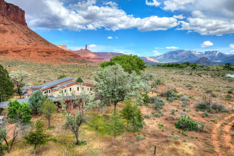 Exquisite Log Cabin Retreat: Unveiling Breathtaking Castle Rock and La Sal Mountain Vistas in Enchanting Castle Valley, UT. Escape to this secluded, well-built custom log home near the valley entrance, offering majestic mountain and red rock views. Natural finishes seamlessly blend with the surrounding landscape. Enjoy gorgeous flagstone floors, ample windows, and an open floor plan, leading to a partially covered flagstone patio for indoor/outdoor living. The master bedroom upstairs boasts panoramic views, a walk-in closet, and a luxurious bathroom. Designed for year-round comfort, it features passive heating/cooling. With storage, a workshop, covered parking, and native landscaping, this home is a true retreat.