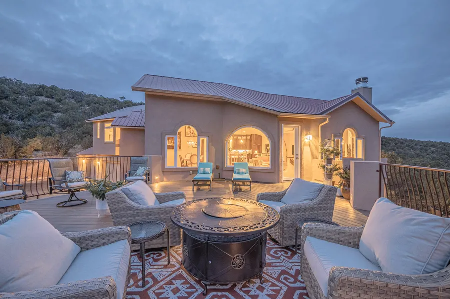 Stunning Placitas home nestled against Cibola National Forest and on 4.8783 acres offers majestic views and quiet, private living. This exquisite home features an open floor plan that includes 3 bedrooms, 3 bathrooms, 2 living areas, & exterior Trex decking. Entertain in style with drive thru valet, ample parking, and fully upgraded chef's kitchen that has sub-zero refrigerator, stainless steel appliances, double ovens, gorgeous labradorite countertops, and copper sinks. Master suite has cozy balcony, fireplace, and elegant freestanding tub with picture window. Enjoy the firepit, private trail access, and lighted gazebo with labyrinth, or unwind in front of the fire or out on the upper deck as you take in the views or gaze at the Milky Way. Gorgeous inside and out. Truly a must see!